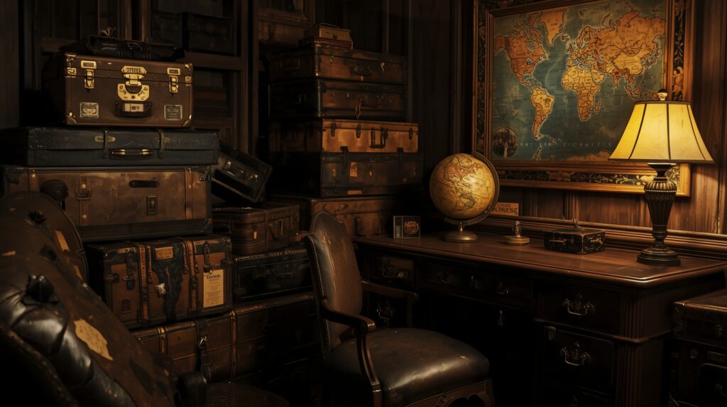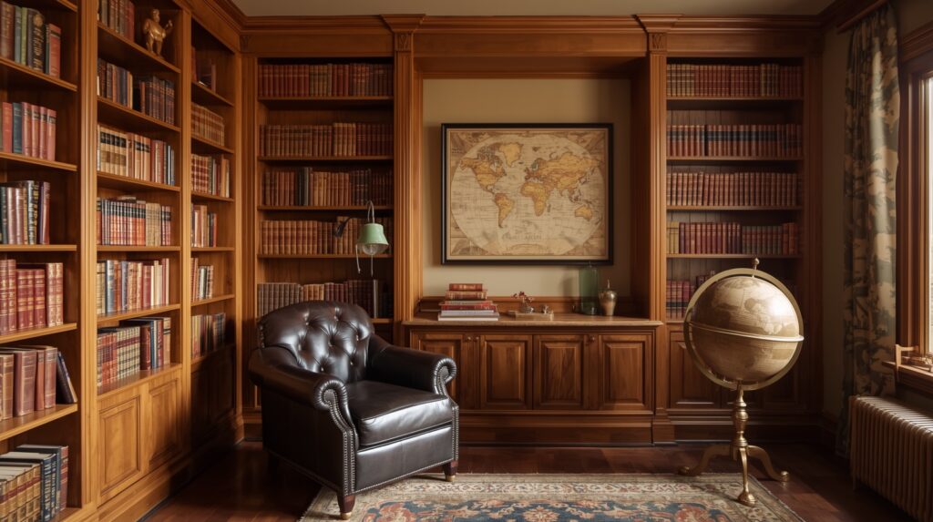 A classic study or library with built-in bookshelves, globe bar carts, and leather armchairs gives off a strong colonial-era ambiance. Opt for antique brass accents and vintage maps.