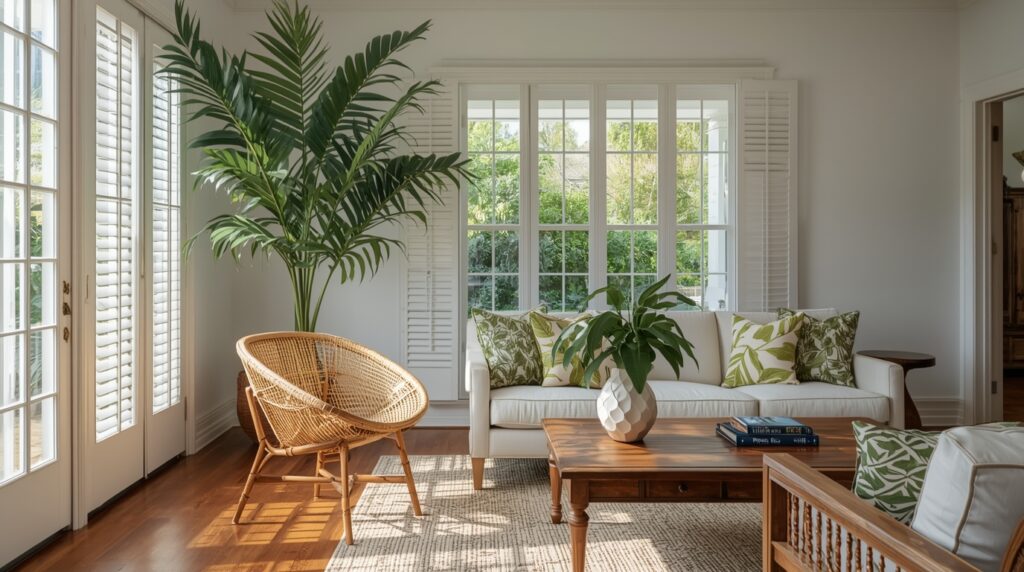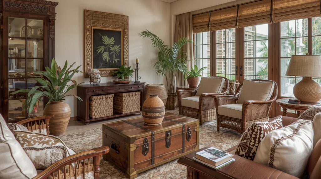 Rattan furniture and wicker accessories—like baskets, chairs, and trunks—add an island-inspired touch. These textures balance the heavier wood tones and evoke a relaxed vibe.