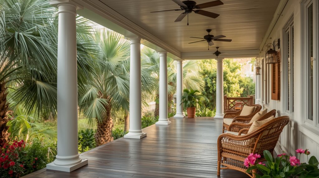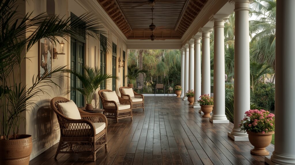 Wide verandas with rattan furniture, ceiling fans, and lush greenery provide that tropical luxury associated with colonial homes. Add wooden balustrades and white-painted columns for authenticity.