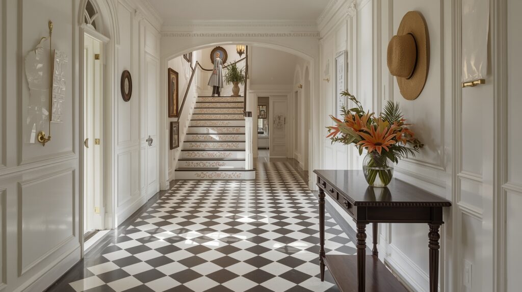 Black-and-white checkerboard floors or handmade terracotta tiles evoke a classic colonial entryway or sunroom. These floors are elegant yet practical in warm climates.