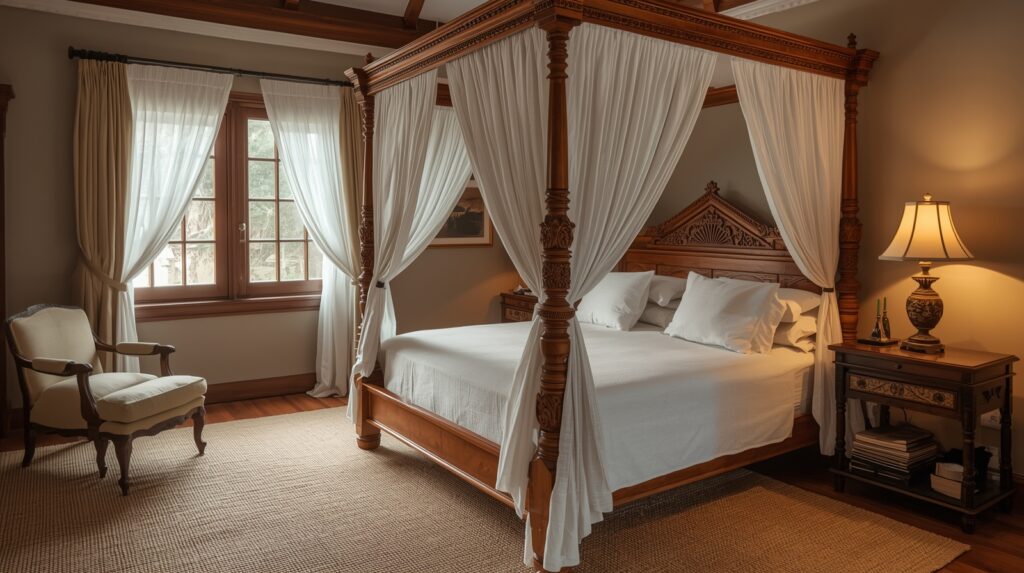 Canopy beds draped with light, flowing fabrics like linen or cotton are central to the colonial bedroom aesthetic. They offer both elegance and practicality, keeping bugs at bay in tropical climates.