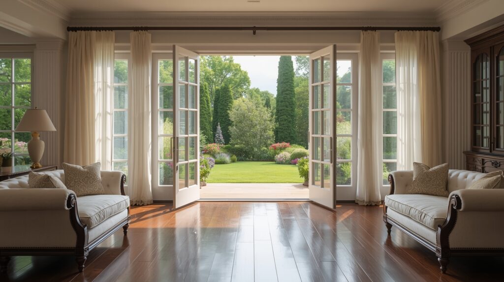 Large French doors that open onto gardens or verandas blur the line between indoor and outdoor living. Add flowing curtains and bamboo blinds to manage sunlight.