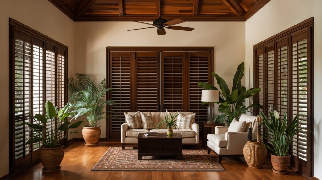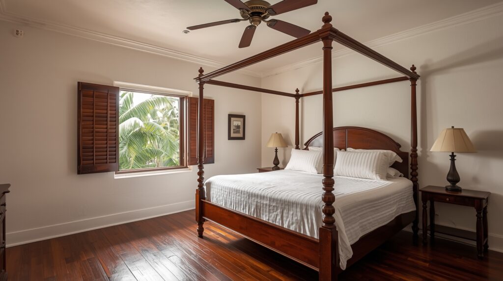 Functional elegance meets timeless design with wooden ceiling fans and louvered shutters. These elements help with ventilation in humid climates while adding character to the space.