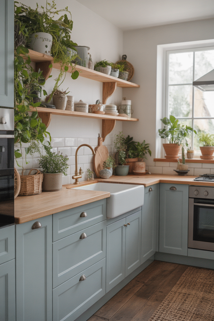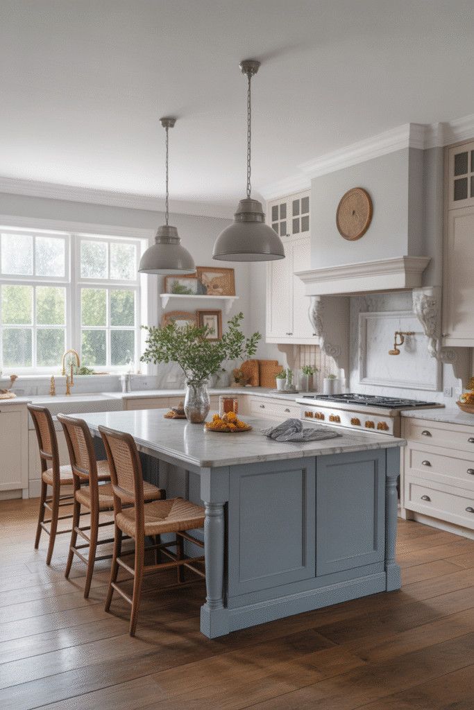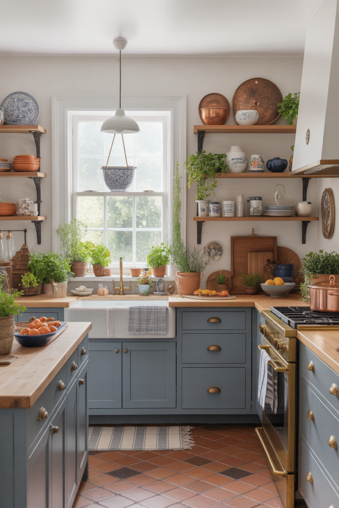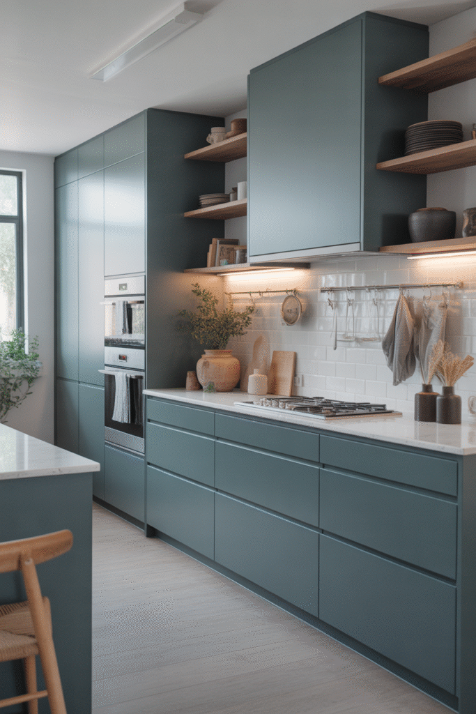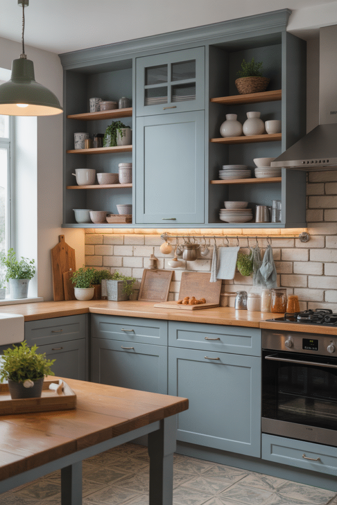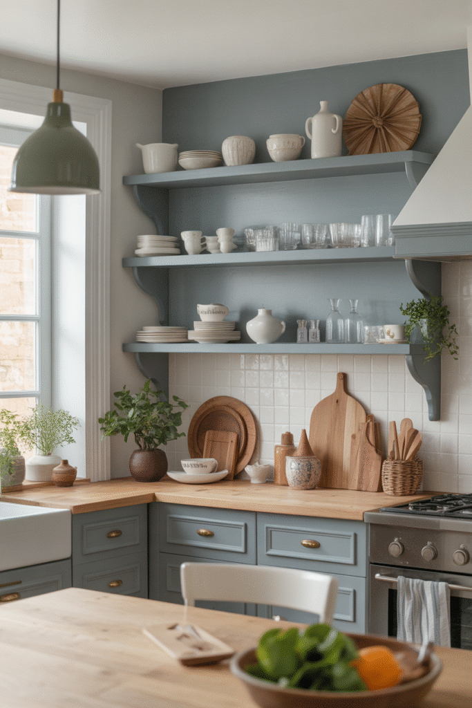 If full cabinets feel heavy, consider open shelving painted in blue-gray. It’s a subtle way to introduce color without overwhelming the space.