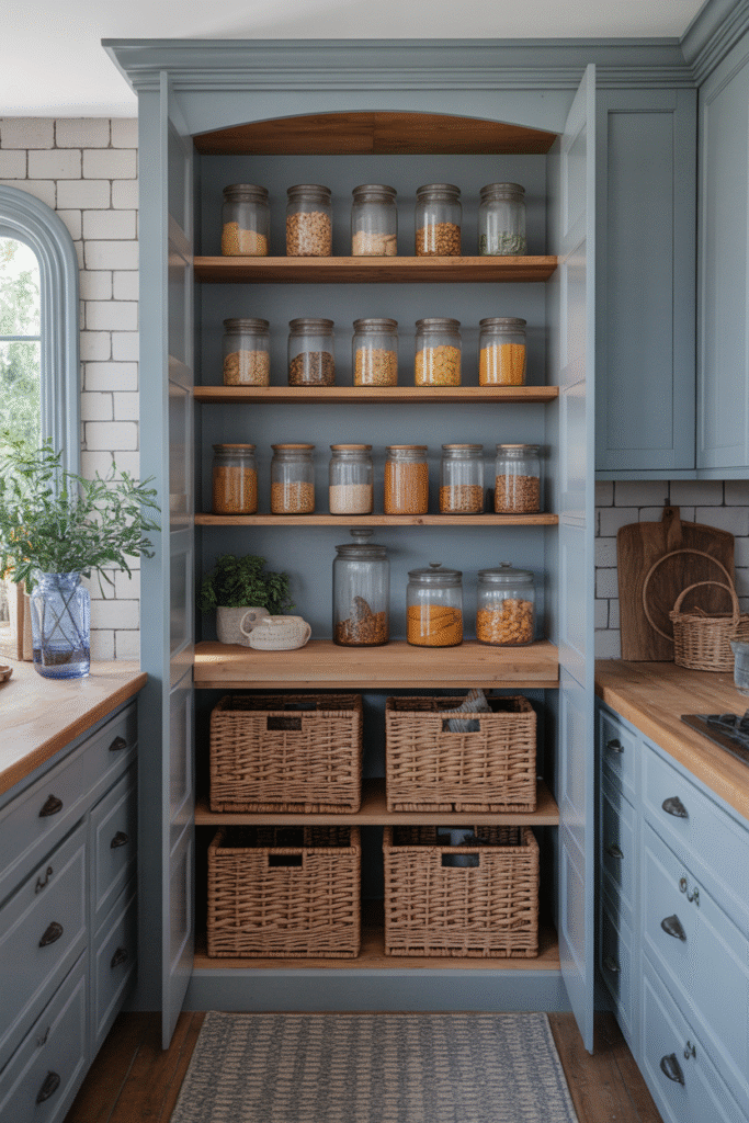 If you have a pantry or built-in cabinet, painting just that section blue-gray adds subtle color while keeping the rest neutral.