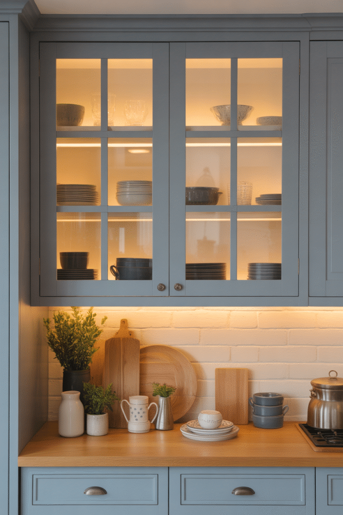 Swap some solid cabinet doors for blue-gray frames with glass inserts. It adds depth and showcases your dishware, making the kitchen feel open and airy.