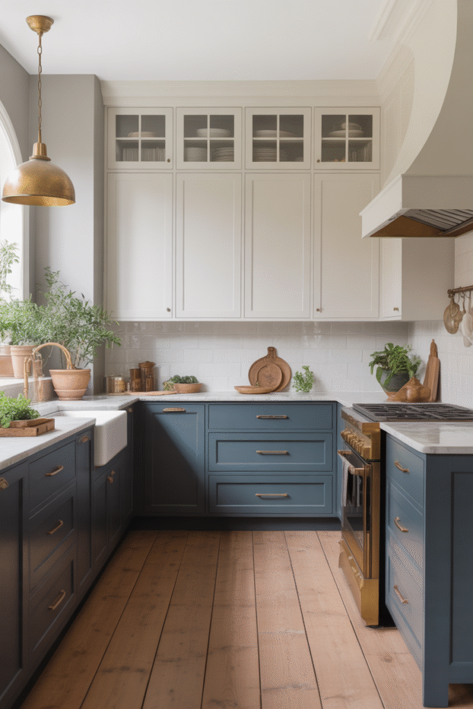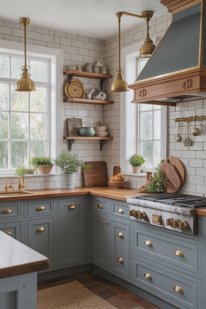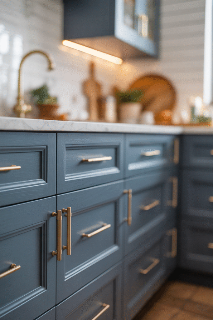 Brass fixtures and lighting complement blue-gray beautifully, giving your kitchen a touch of elegance without expensive renovations.