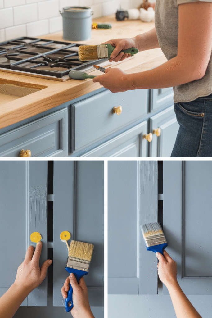 - Paint lower cabinets with blue-gray paint in thin, even coats.