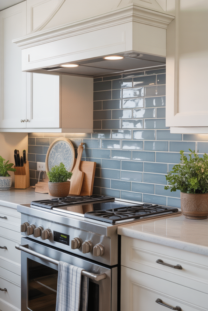 - Choose blue-gray tiles or peel-and-stick backsplash panels.