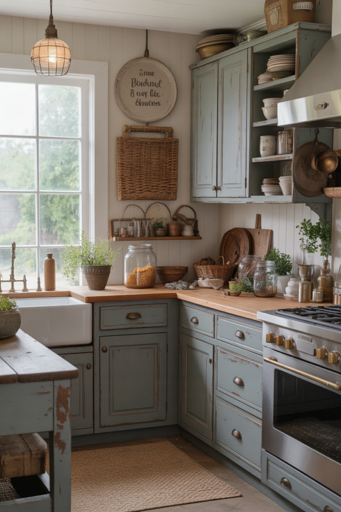 For a farmhouse or vintage feel, try distressed blue-gray cabinets. This technique adds texture and personality without costing a fortune.