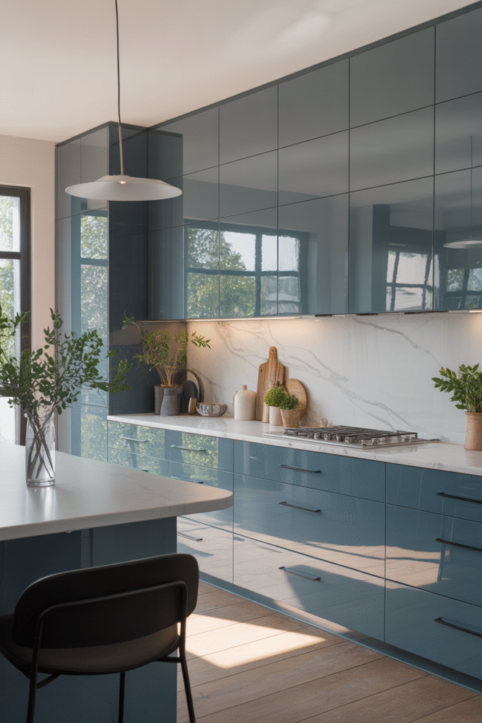 If you like a sleek look, glossy blue-gray cabinets reflect light and make your kitchen feel bigger and brighter, all while keeping things classy.