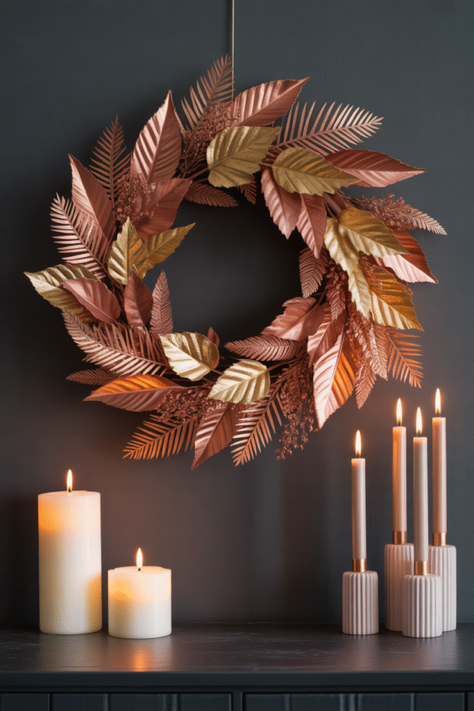 For a chic, contemporary vibe, use metallic foliage in gold and copper tones. It catches the light beautifully and feels festive as the holidays approach.