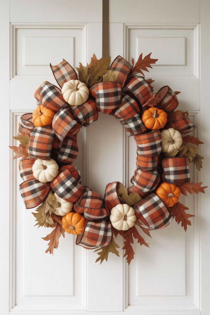 Nothing says “fall” like plaid! Wrap a wreath form in a tartan-patterned ribbon and add matching accents in warm oranges or browns.