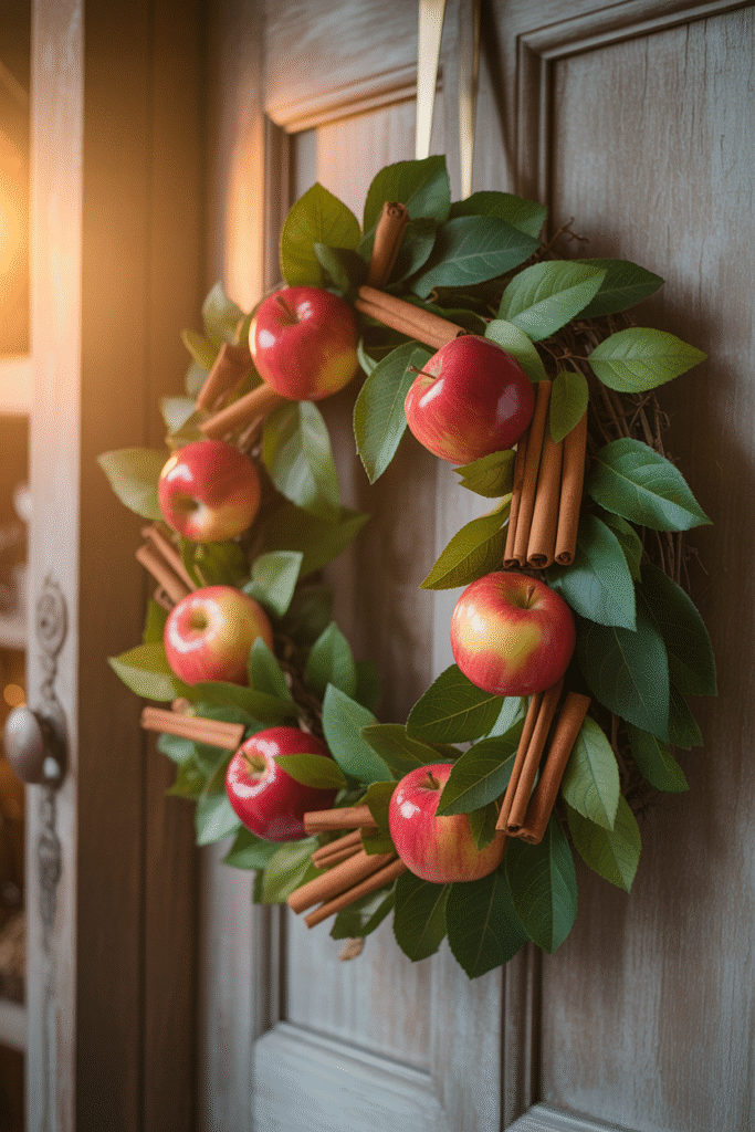 Bring the scent of autumn baking outdoors with a wreath that mixes faux apples, cinnamon sticks, and greenery. It’s cozy, homey, and utterly inviting.