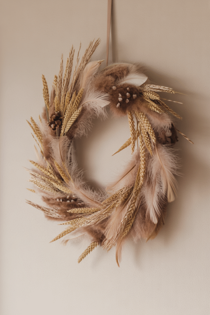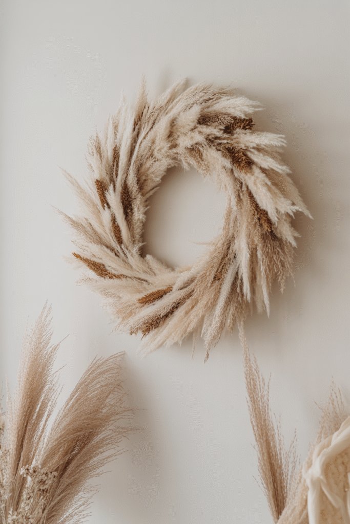 A modern, boho-inspired wreath made from fluffy pampas grass adds texture and elegance. It’s perfect for neutral walls and minimalist homes.