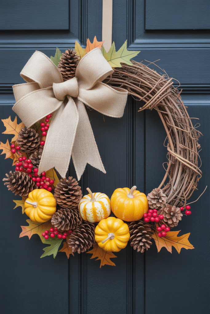 Add a cozy, country twist by tying a large burlap bow around a grapevine wreath base. Mix in pinecones, faux berries, and mini pumpkins for a rustic finish.