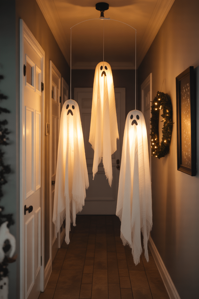 Start with a classic! Floating ghosts are back in 2025 but with a chic twist. Use cheesecloth, wire hangers, and LED tea lights to create eerie, ethereal spirits that hover in your hallway or front yard. They’re creepy and cute.