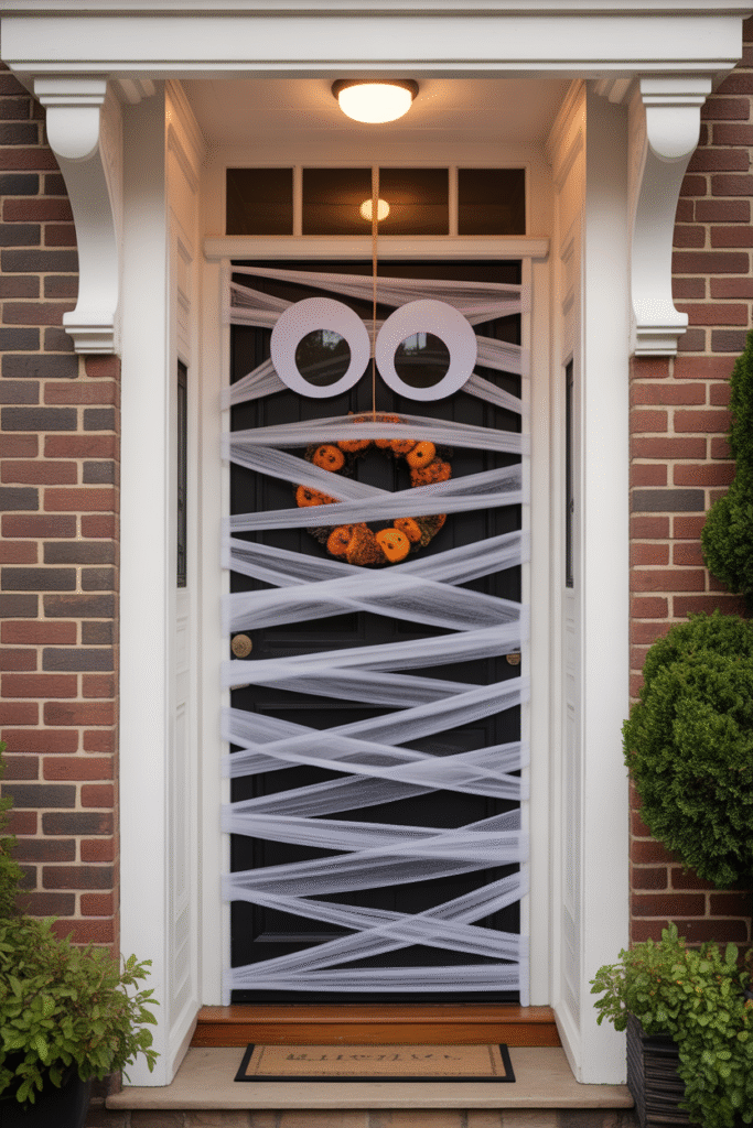 Wrap your front door in white streamers or gauze to create a mummy face — complete with googly eyes. It’s a family-friendly option that’s great for trick-or-treaters.