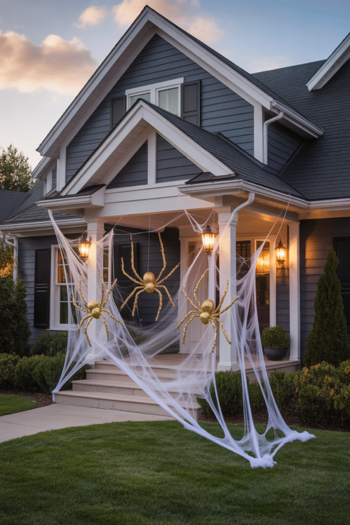 Take it up a notch with jumbo webbing across your porch or entryway. Then swap plastic spiders for glittery gold or matte black ones for a glam-goth look.