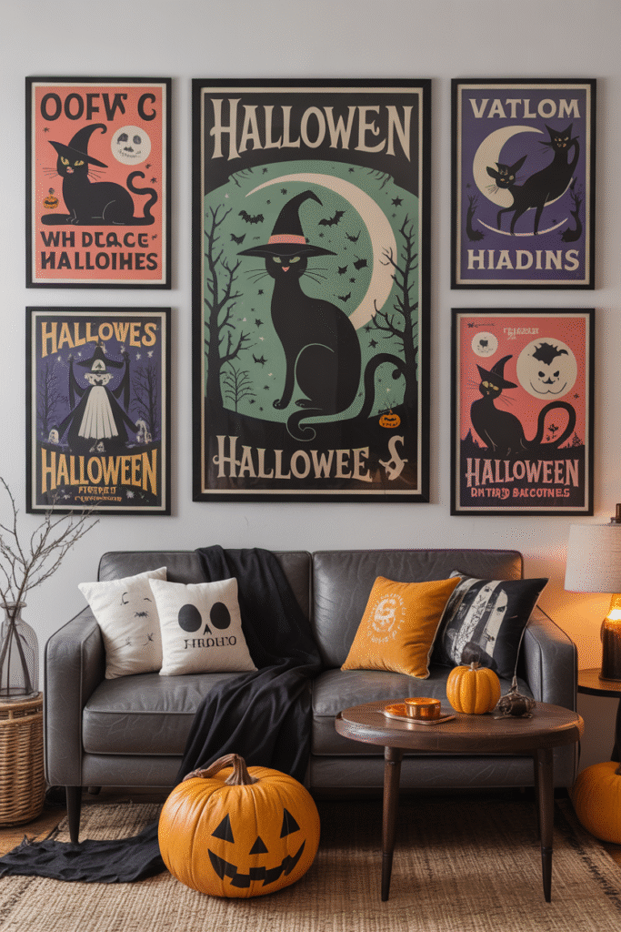 Frame retro Halloween prints and hang them gallery-style. Think black cats, crescent moons, and 1920s witches. These add charm without being over-the-top scary.