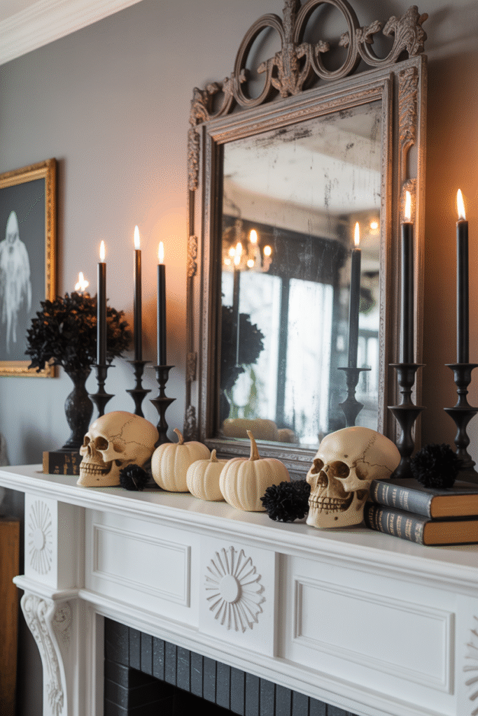 Monochrome is in. Layer your mantel with black candlesticks, white pumpkins, vintage books, and skull figurines. Add a distressed mirror or a gothic-style frame for extra Victorian flair.