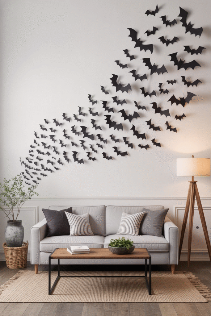 Simple but effective. Cut out dozens of black bats in various sizes and stick them on a wall, curving up like they’re flying. It’s cheap, dramatic, and makes a great photo backdrop.