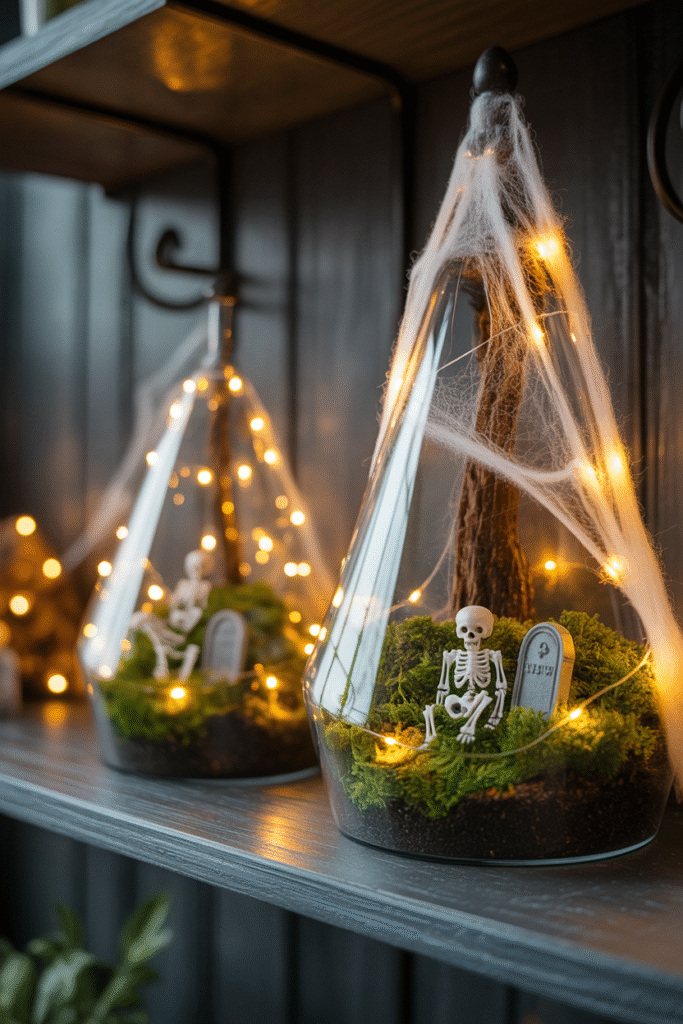 Grab a few glass cloches or terrariums and fill them with moss, tiny skeletons, miniature tombstones, and fairy lights. It’s like a creepy little world inside a dome.