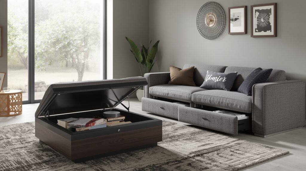 Opt for furniture that works harder — like a storage ottoman, a fold-out sofa, or a coffee table with shelves.
